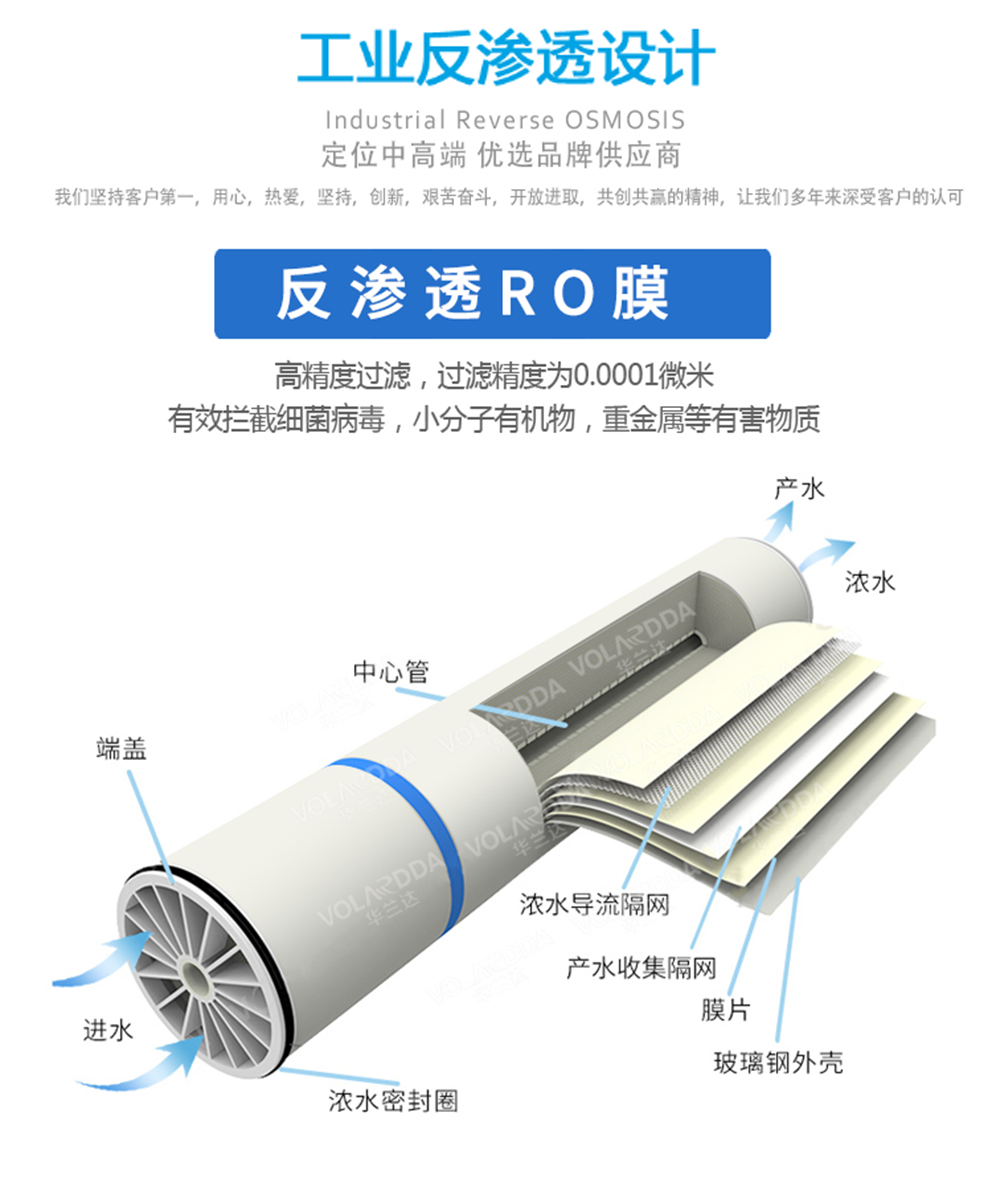 由于反滲透膜分離技術(shù)的先進(jìn)、高效和節(jié)能特性,各部門(mén)領(lǐng)域均得到廣泛的應(yīng)用,已有大型的反滲透水處理設(shè)備用于海水淡化,苦咸水凈化及工業(yè)廢水處理。利用反滲透脫鹽,可制備純水或超純水用于半導(dǎo)體、集成電路制造用水、發(fā)電廠鍋爐用水、醫(yī)藥行業(yè)用水、化工行業(yè)用水、飲料行業(yè)用水及其他行業(yè)(化妝品、印染、電鍍等)用水。利用其脫水濃縮特性,還可用來(lái)濃縮果蔬汁、牛奶、中藥等。